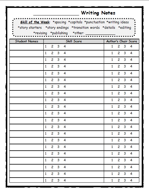 I choose a skill of the week to focus on. I circle a number for well the student applies that skill. I also circle a number to grade a student on how well they read and answered questions during author's chair.